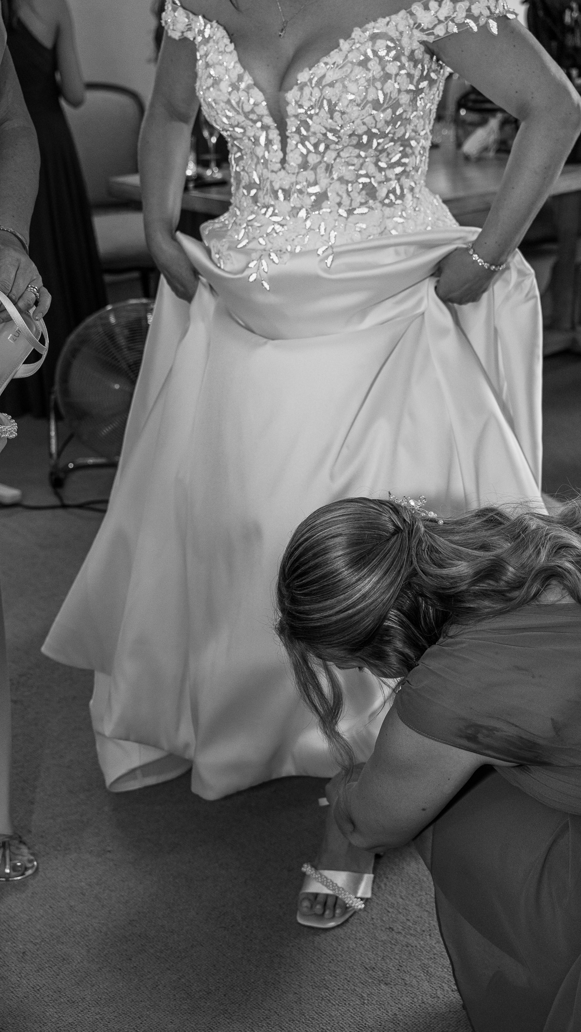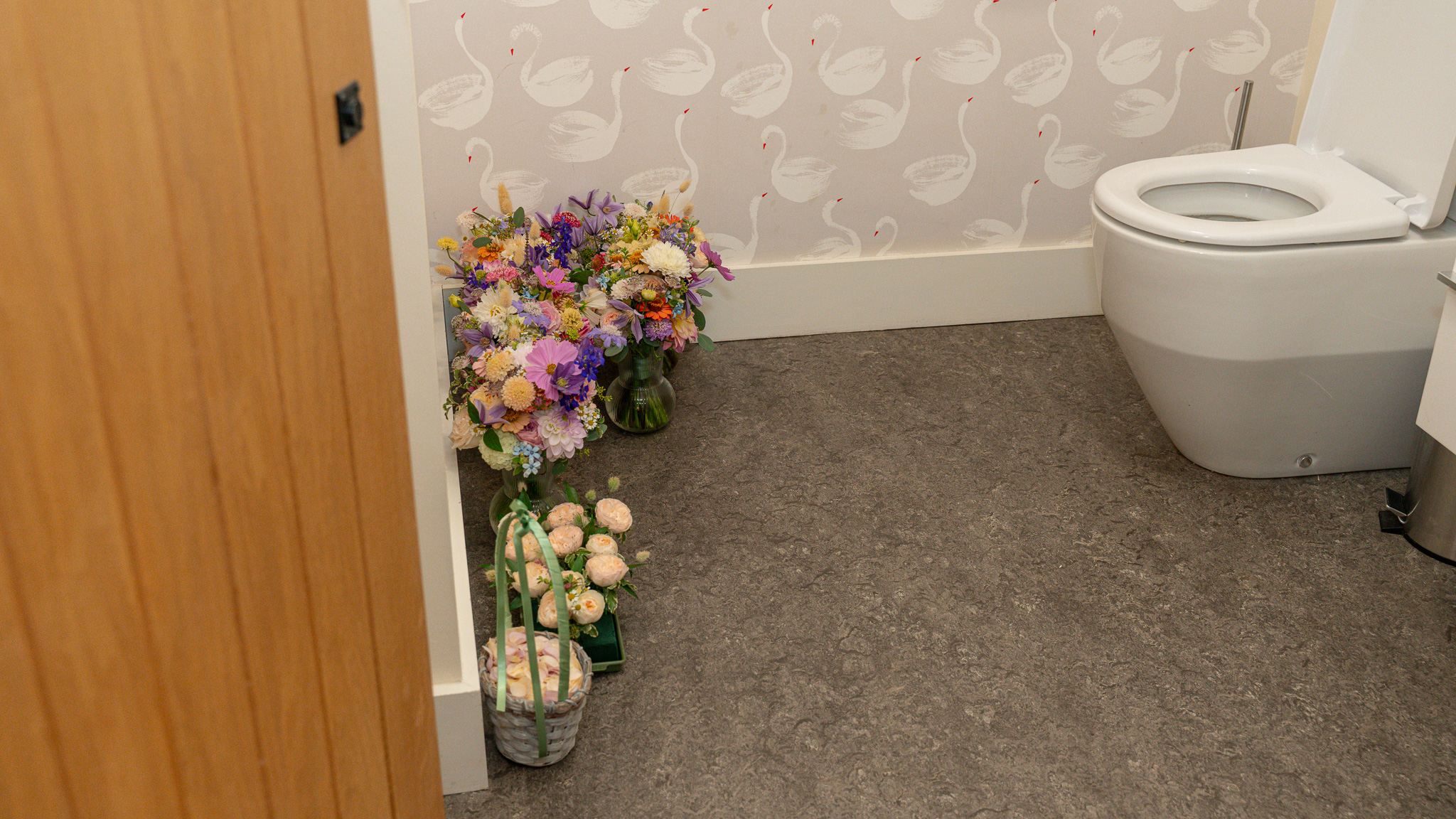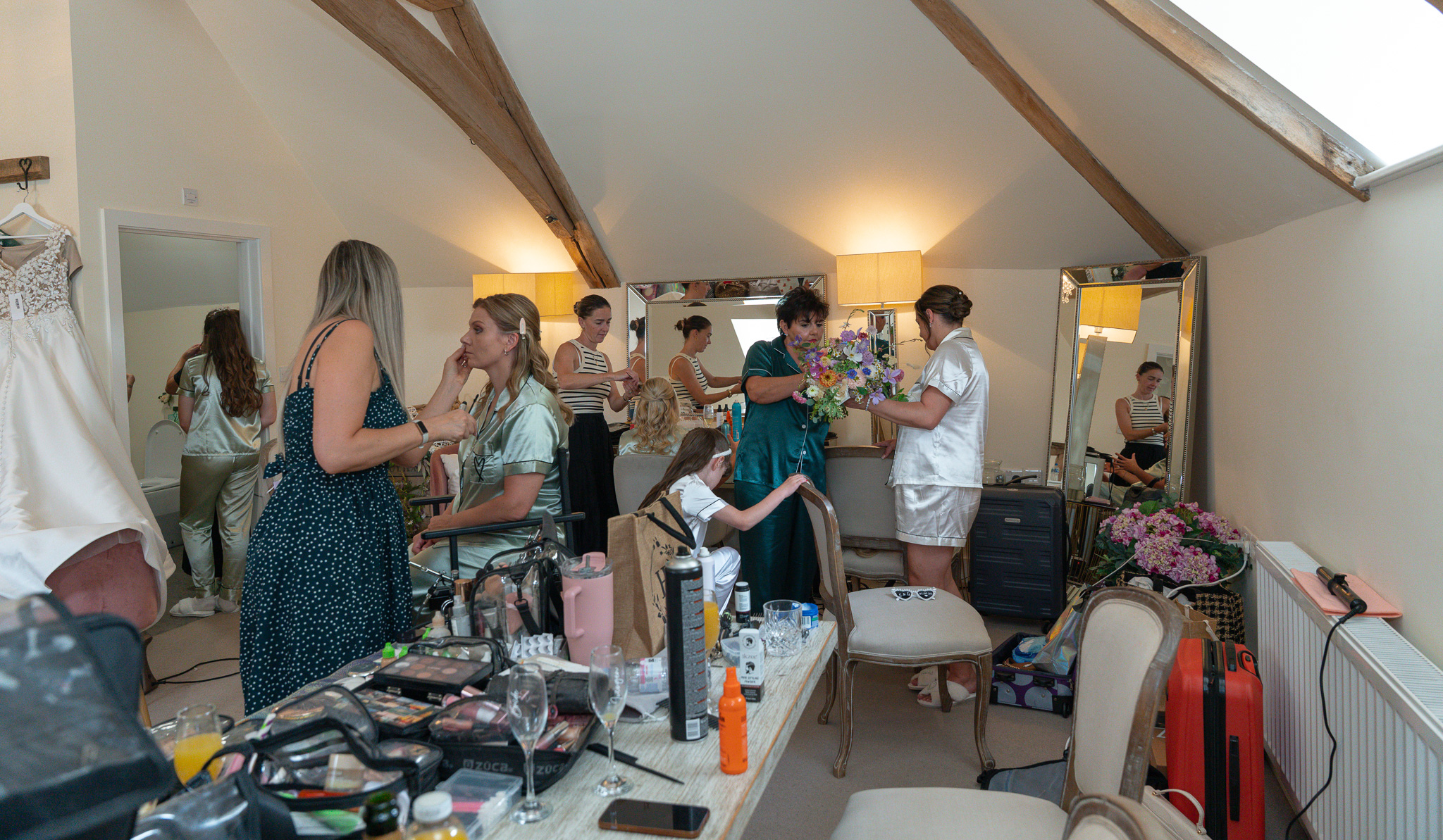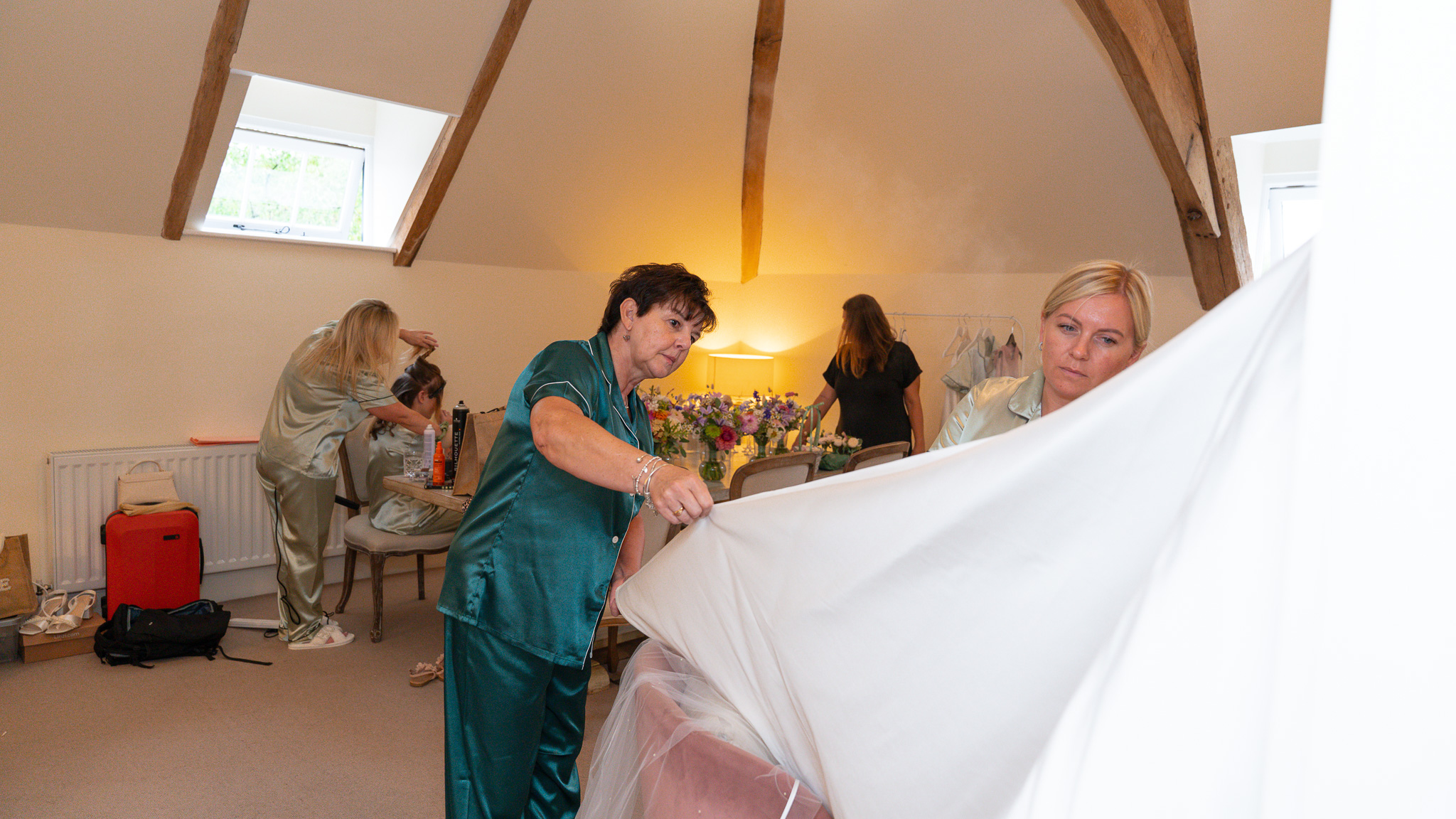 Meanwhile, the bridal suite was buzzing with champagne glasses clinking, hairdryers humming, and fans blasting from every corner in a desperate attempt to cool things down. Even the bouquets had to retreat to the shadows of the bathroom to stop themselves from wilting before their big debut.