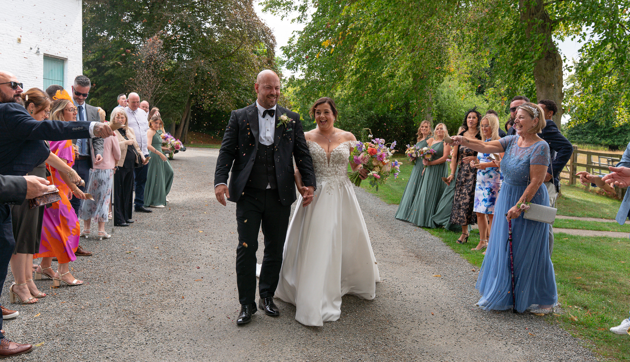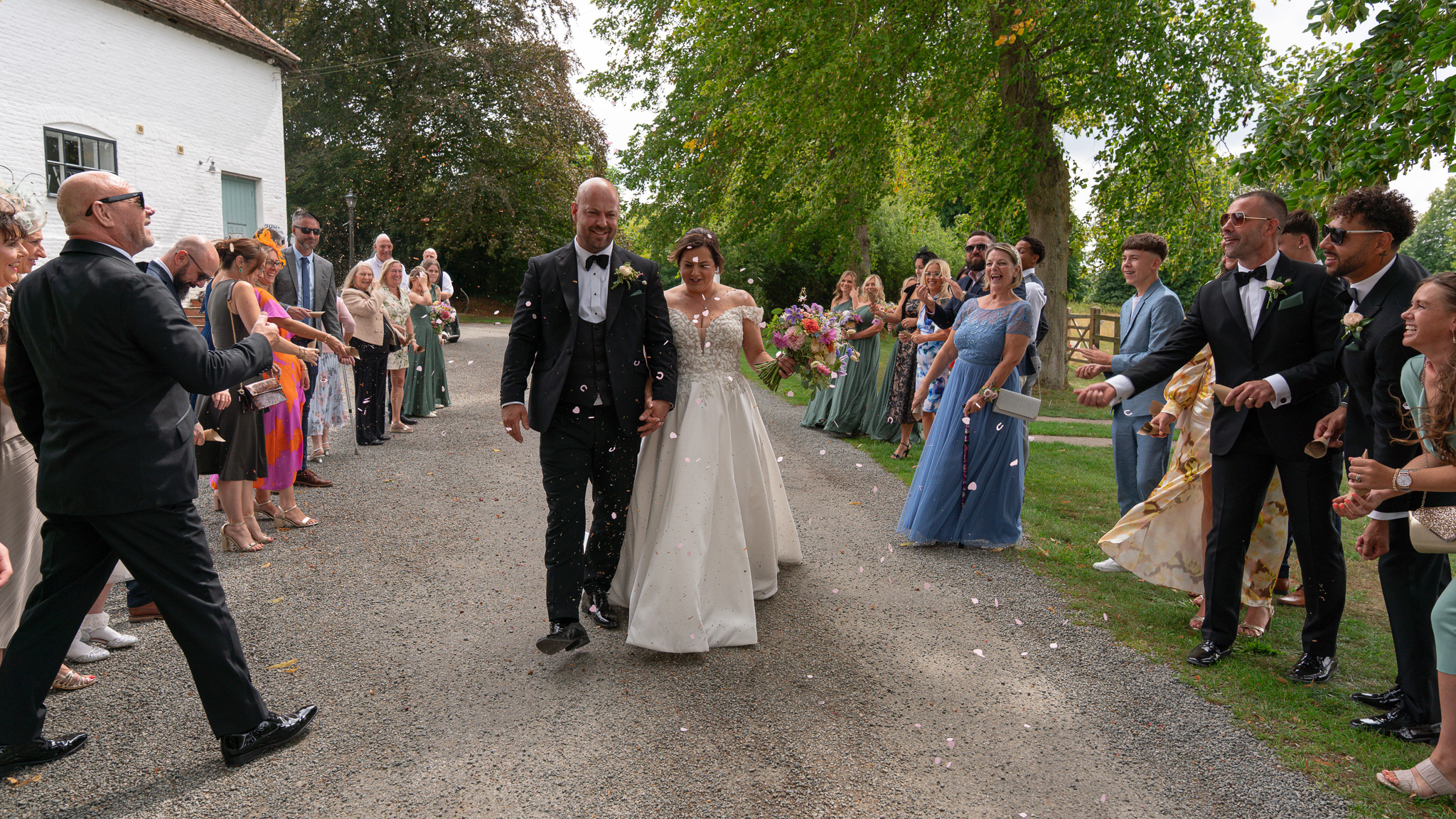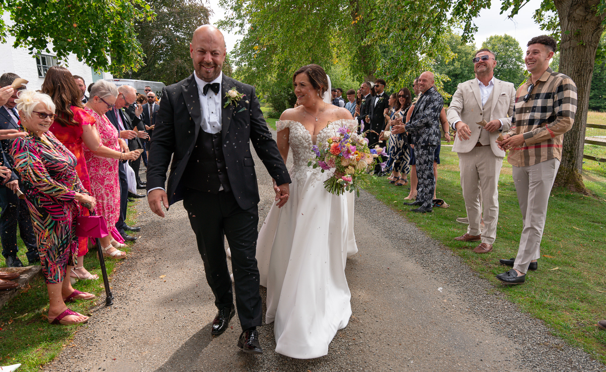 Then came the confetti. And let me tell you, these guests did not hold back! It was full-throttle confetti mayhem. Most of it ended up in George’s mouth, which made for some hilarious photos and a lot of belly laughs, just how we like it at a fun summer wedding in Hertfordshire.