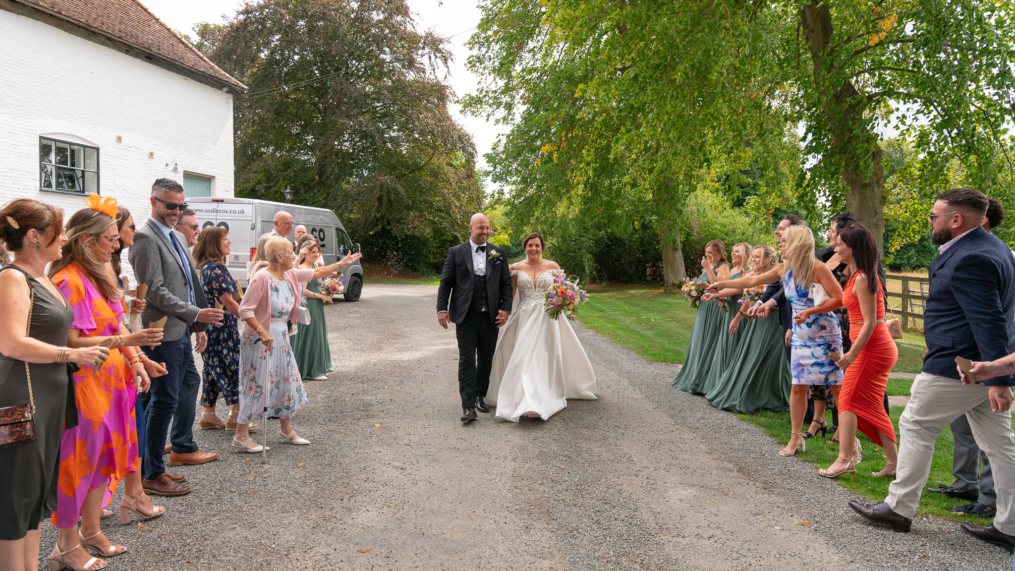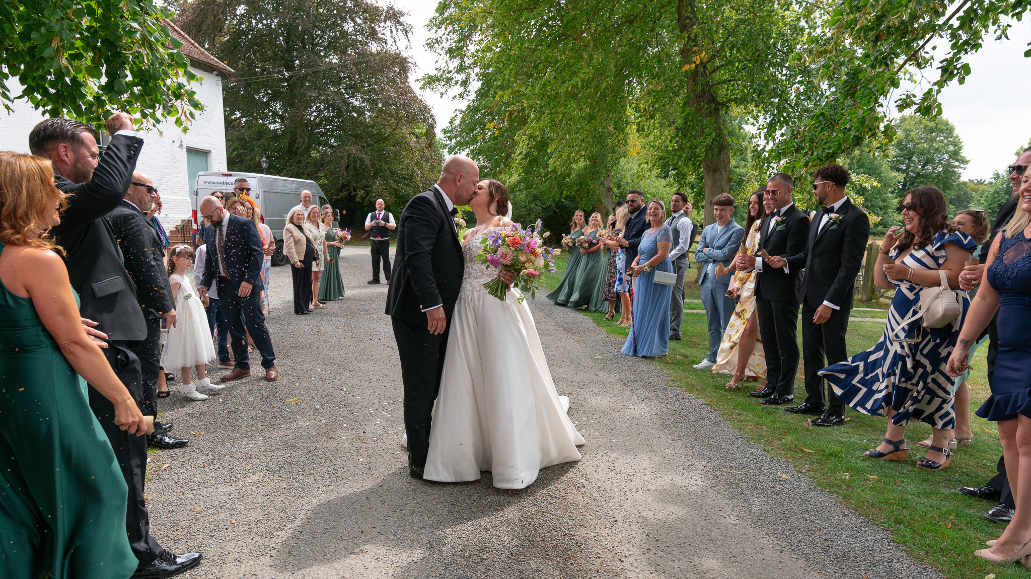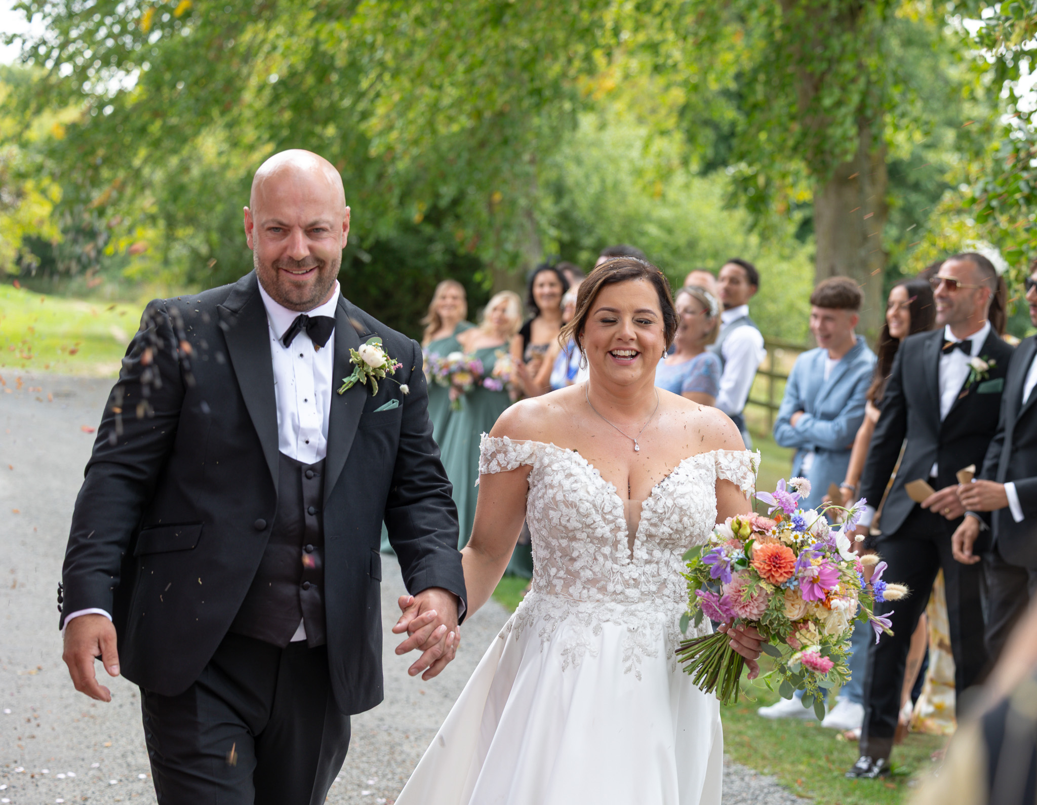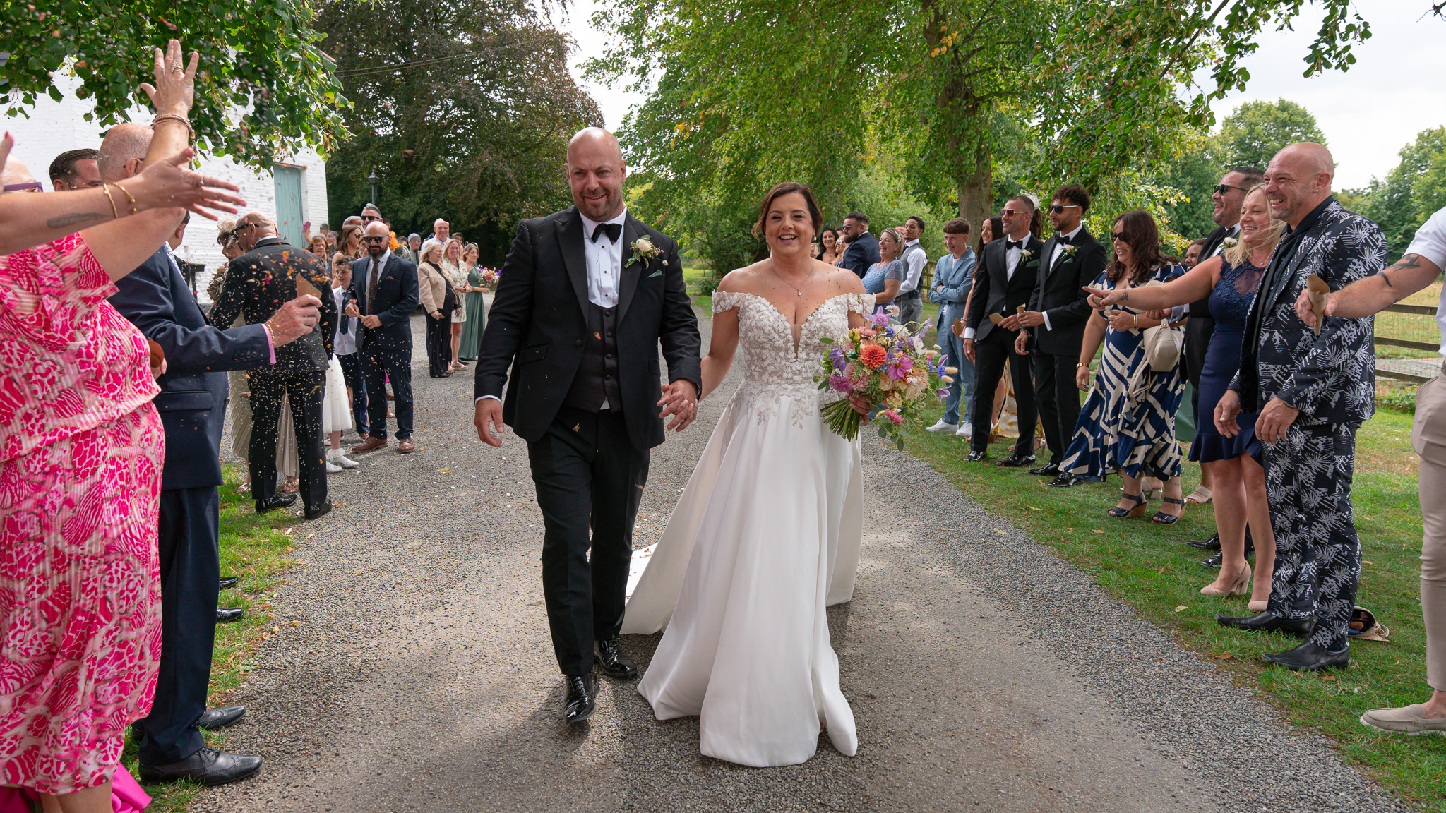 Then came the confetti. And let me tell you, these guests did not hold back! It was full-throttle confetti mayhem. Most of it ended up in George’s mouth, which made for some hilarious photos and a lot of belly laughs, just how we like it at a fun summer wedding in Hertfordshire.