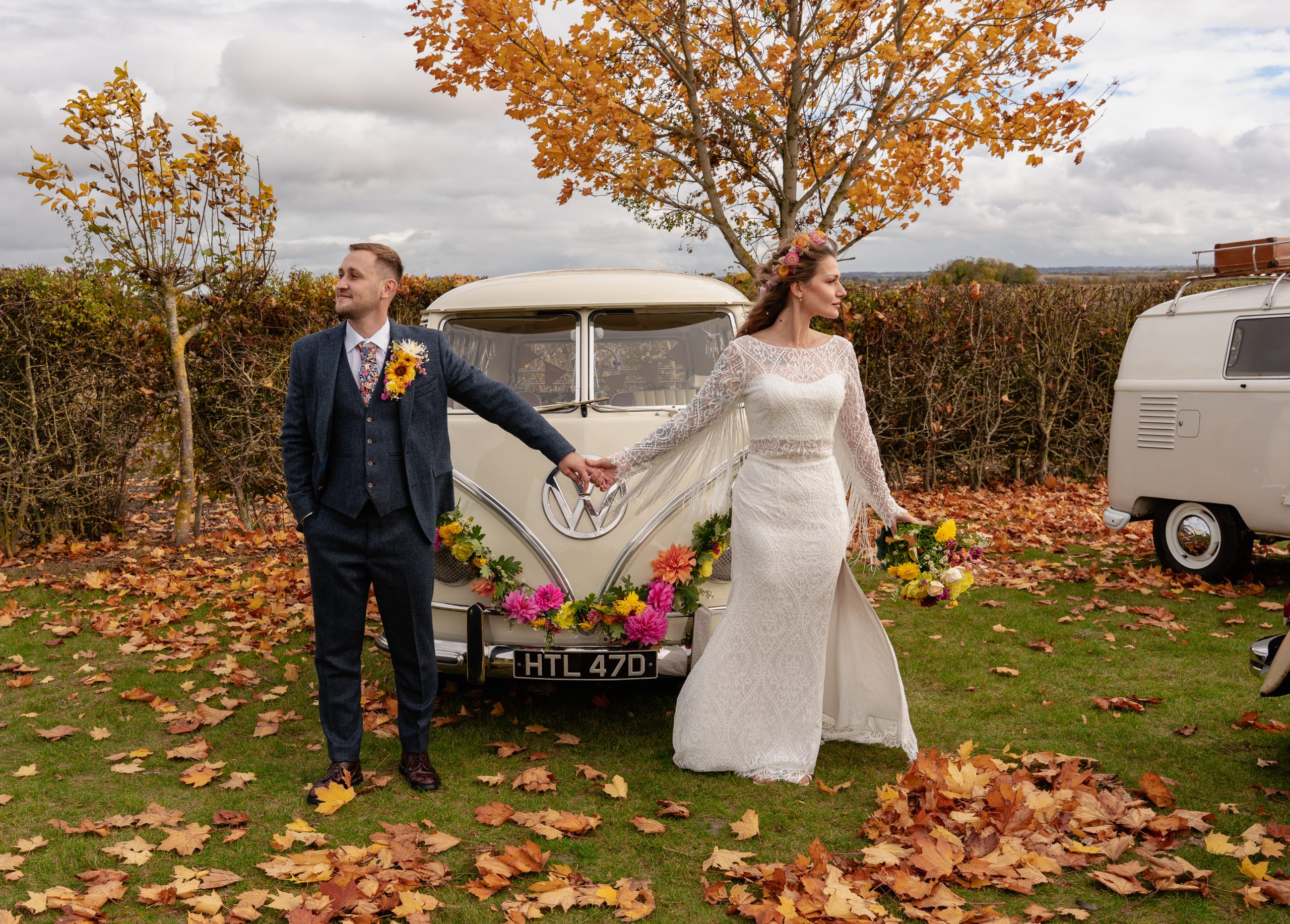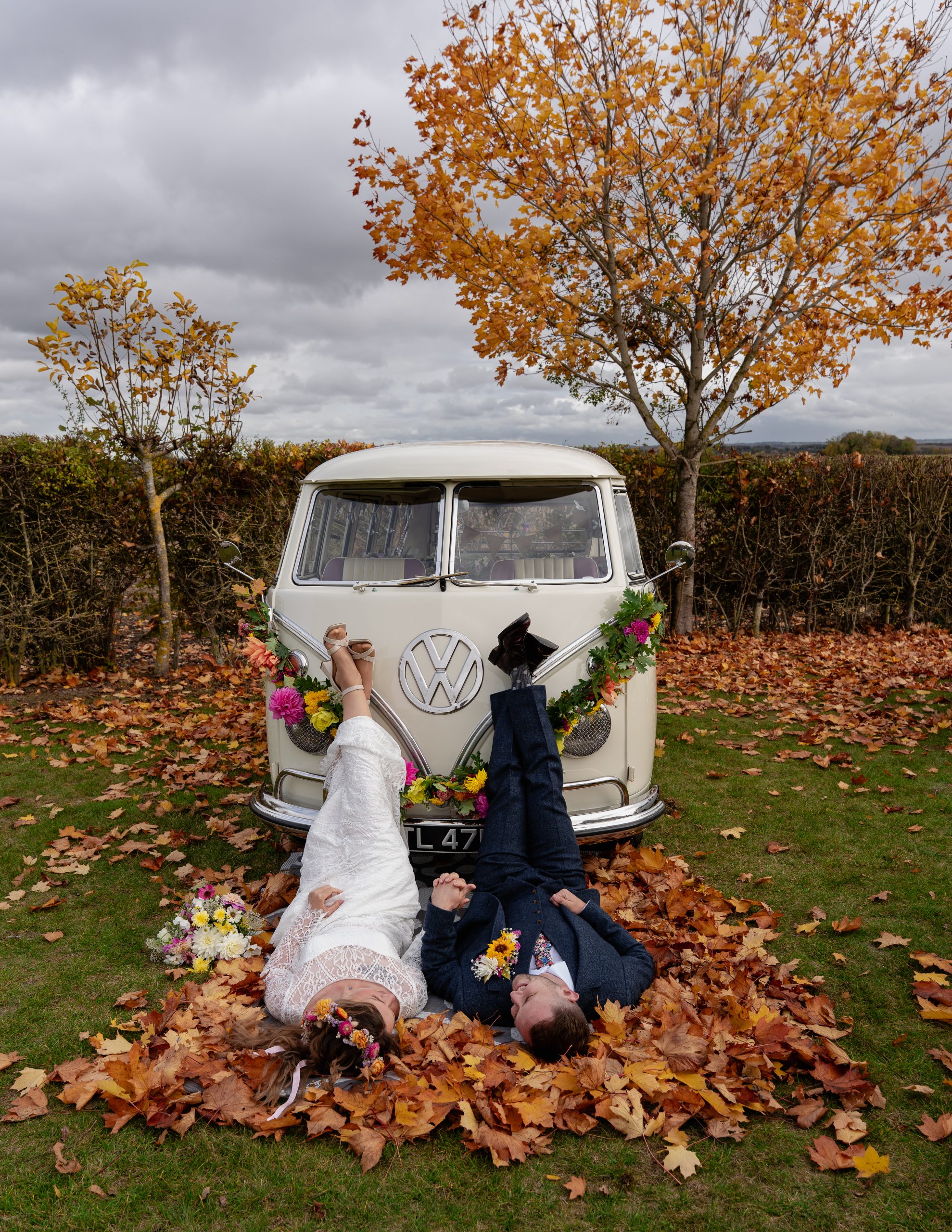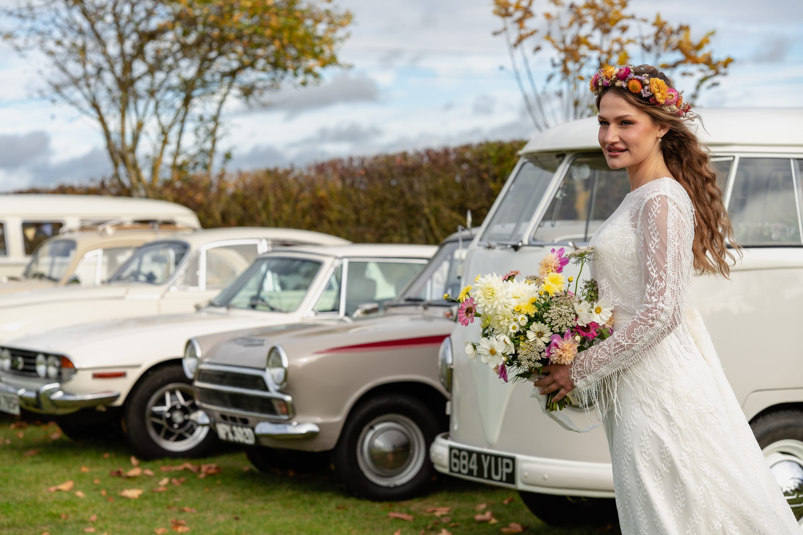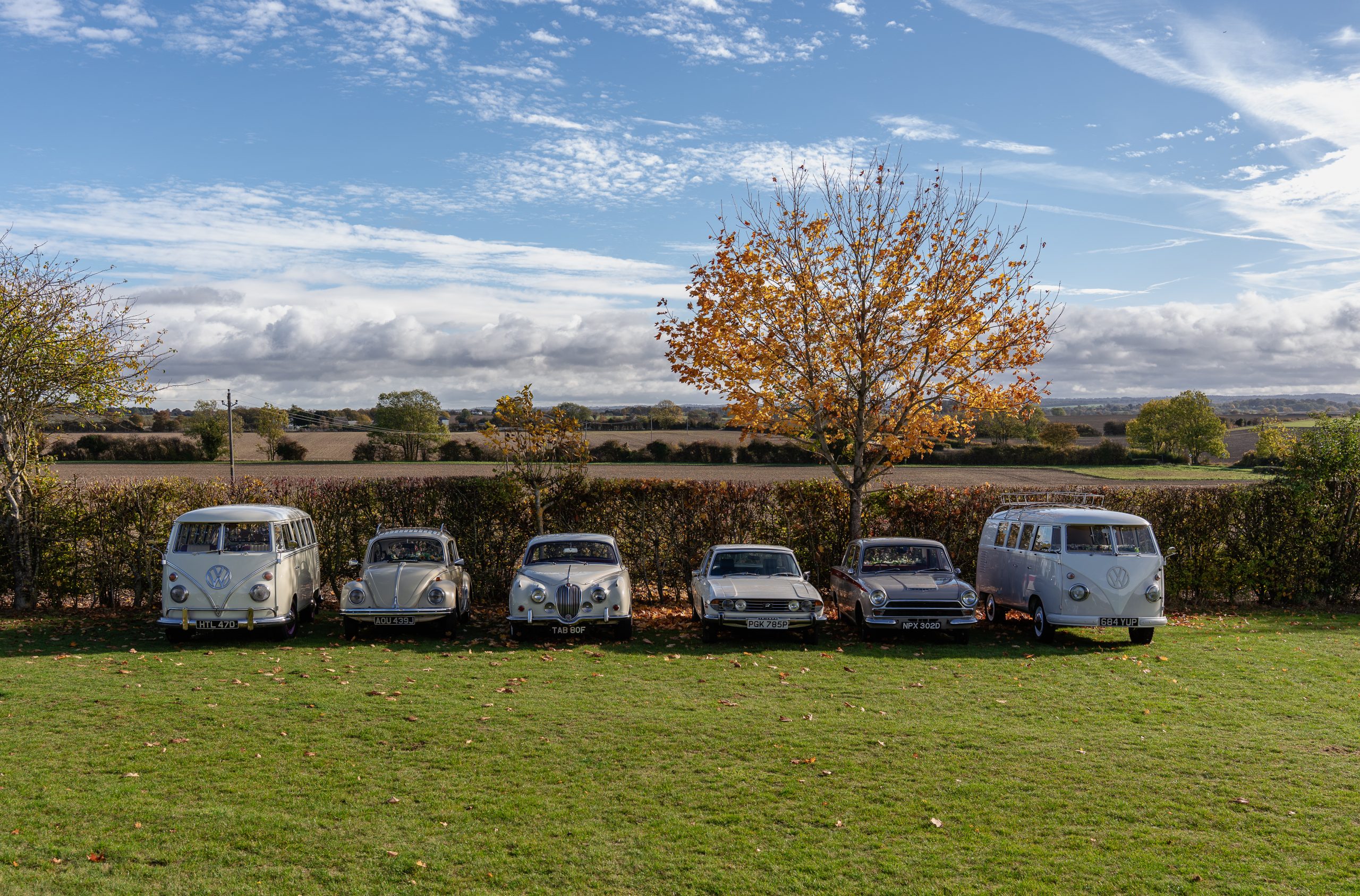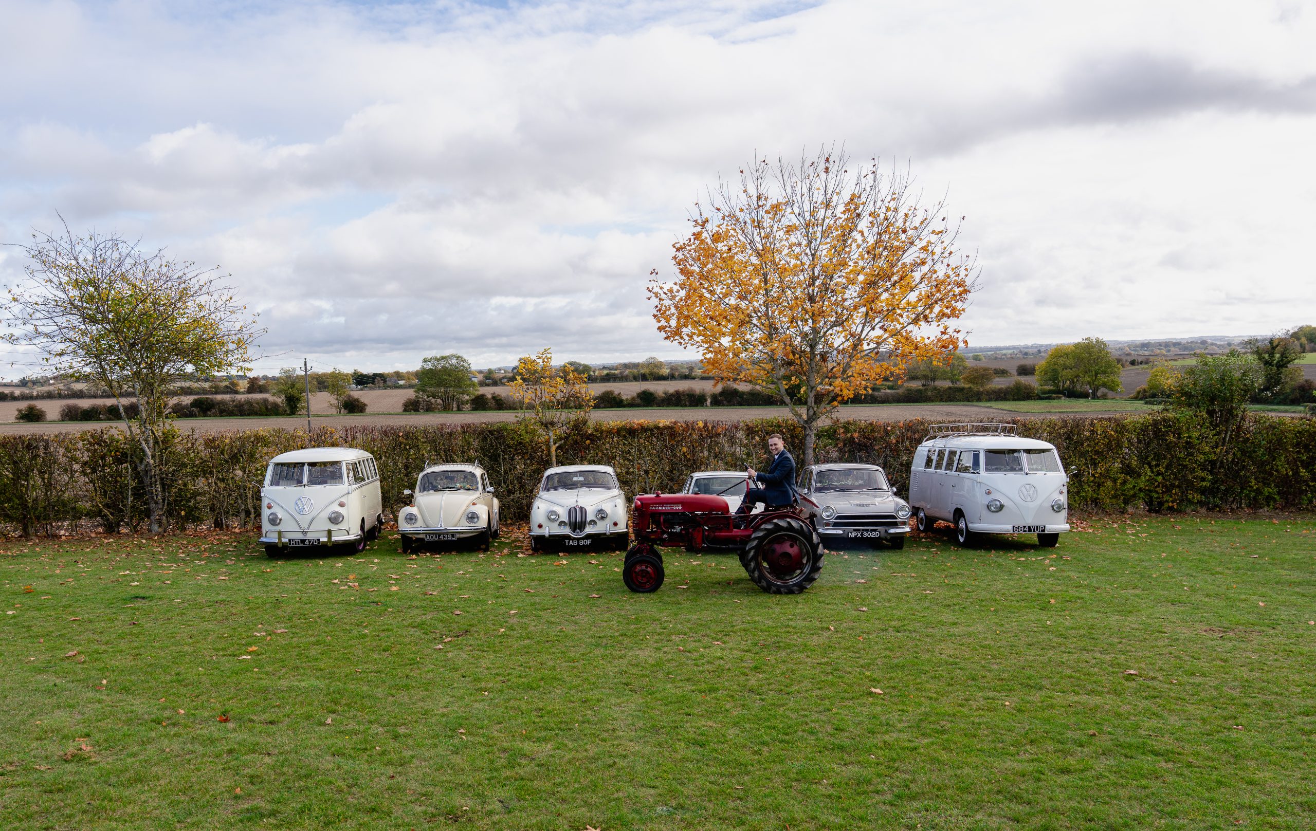 Now, you might think, “But Tracy, those cars speak for themselves!” And you’d be absolutely right. Buuuut Kate didn’t want them just speaking; she wanted them performing a full West-End show, lined up together in all their autumnal countryside glory. Think rolling hills, golden leaves, retro charm, and a bit of Hertfordshire wedding photographer magic sprinkled over the top.