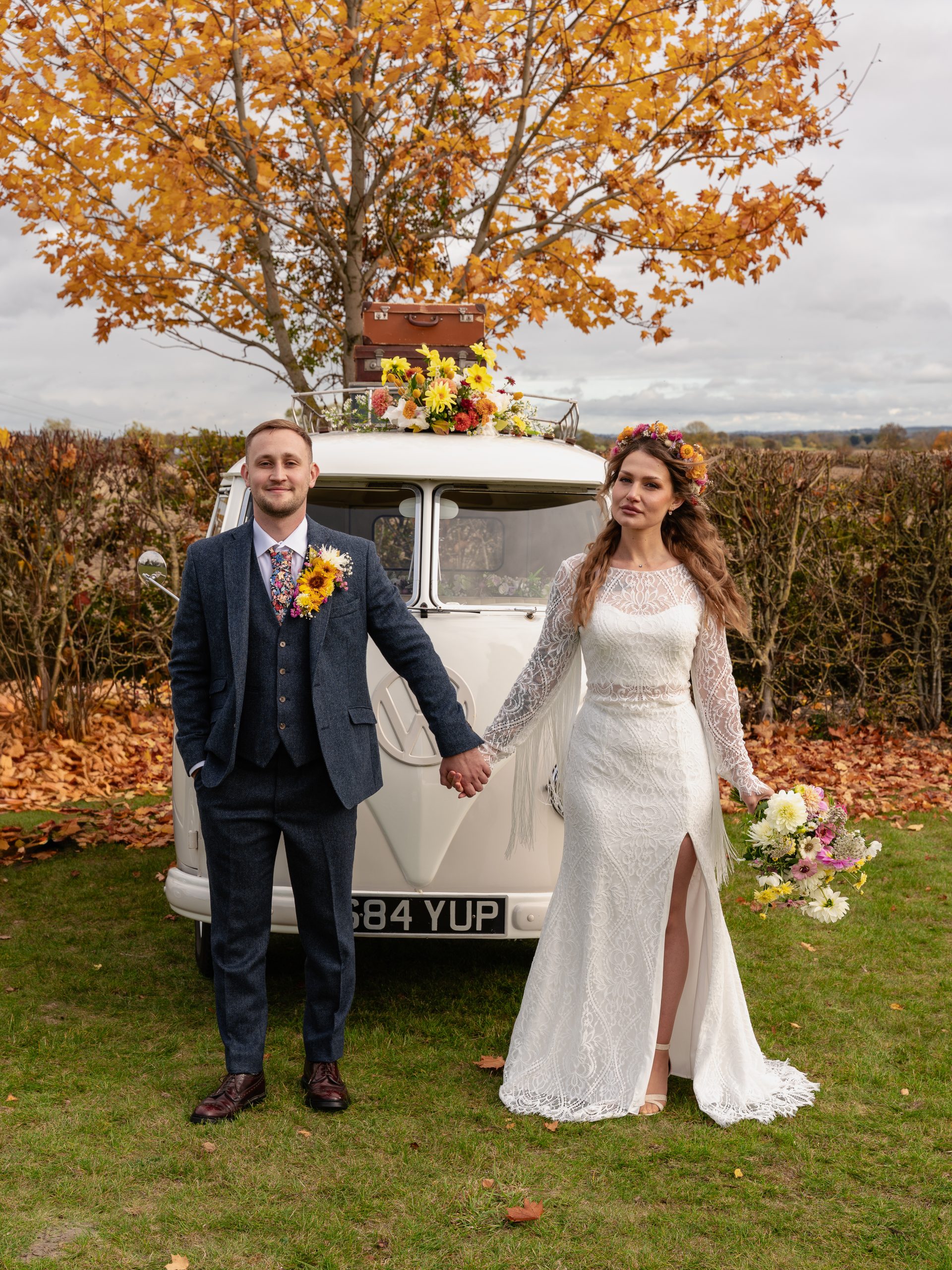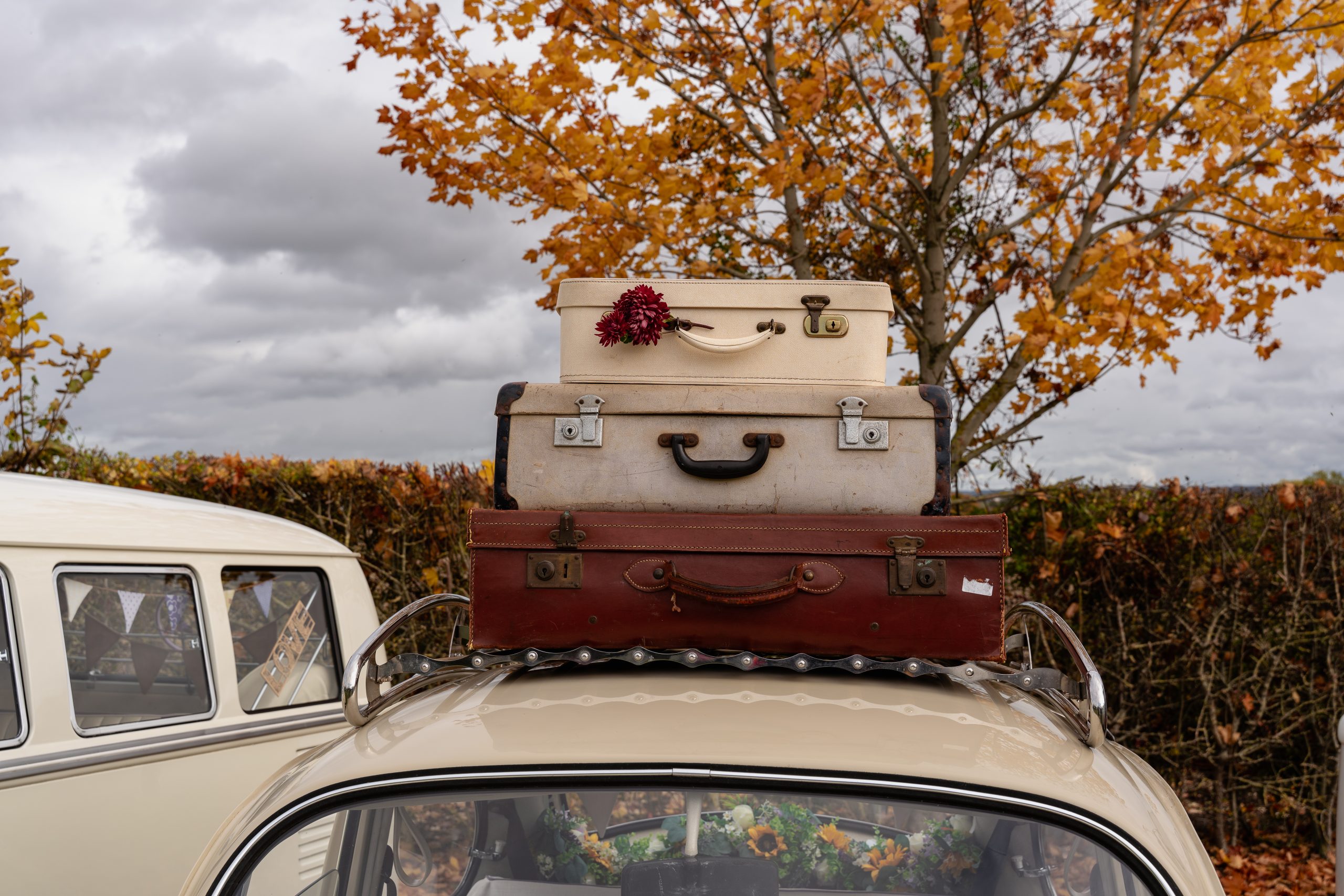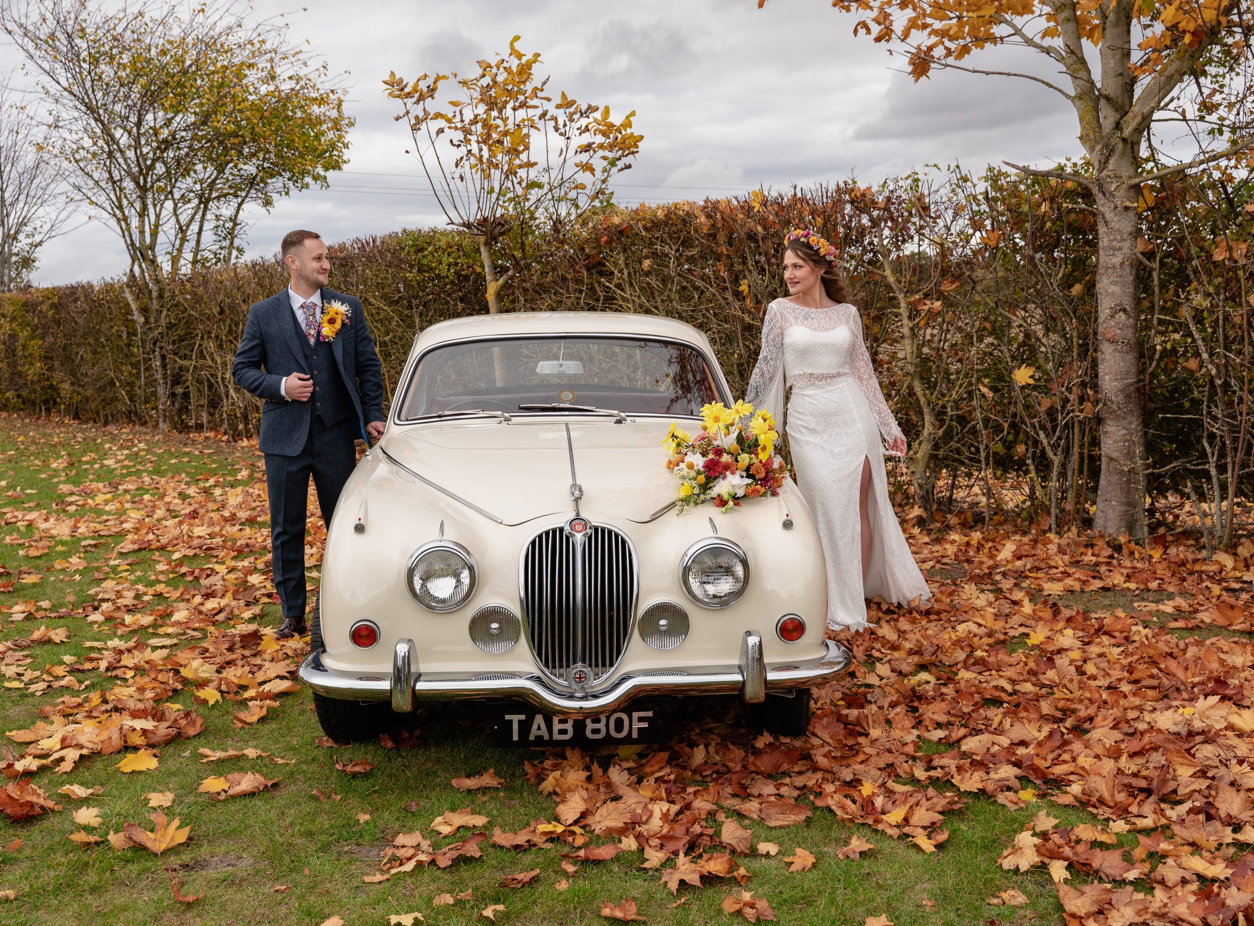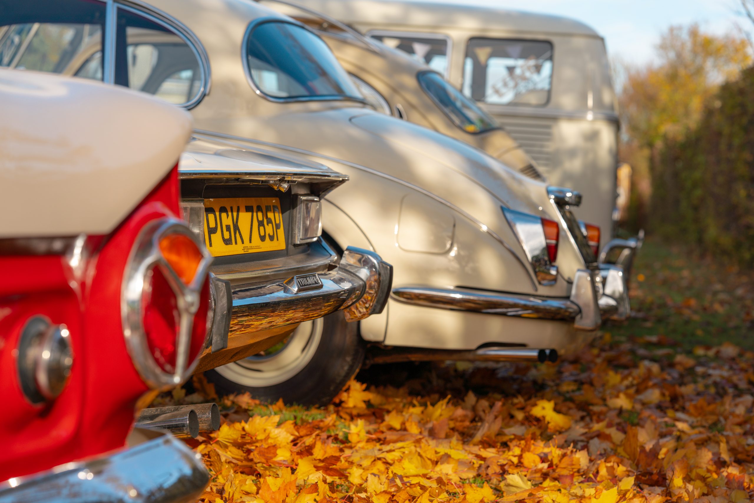 Now, you might think, “But Tracy, those cars speak for themselves!” And you’d be absolutely right. Buuuut Kate didn’t want them just speaking; she wanted them performing a full West-End show, lined up together in all their autumnal countryside glory. Think rolling hills, golden leaves, retro charm, and a bit of Hertfordshire wedding photographer magic sprinkled over the top.