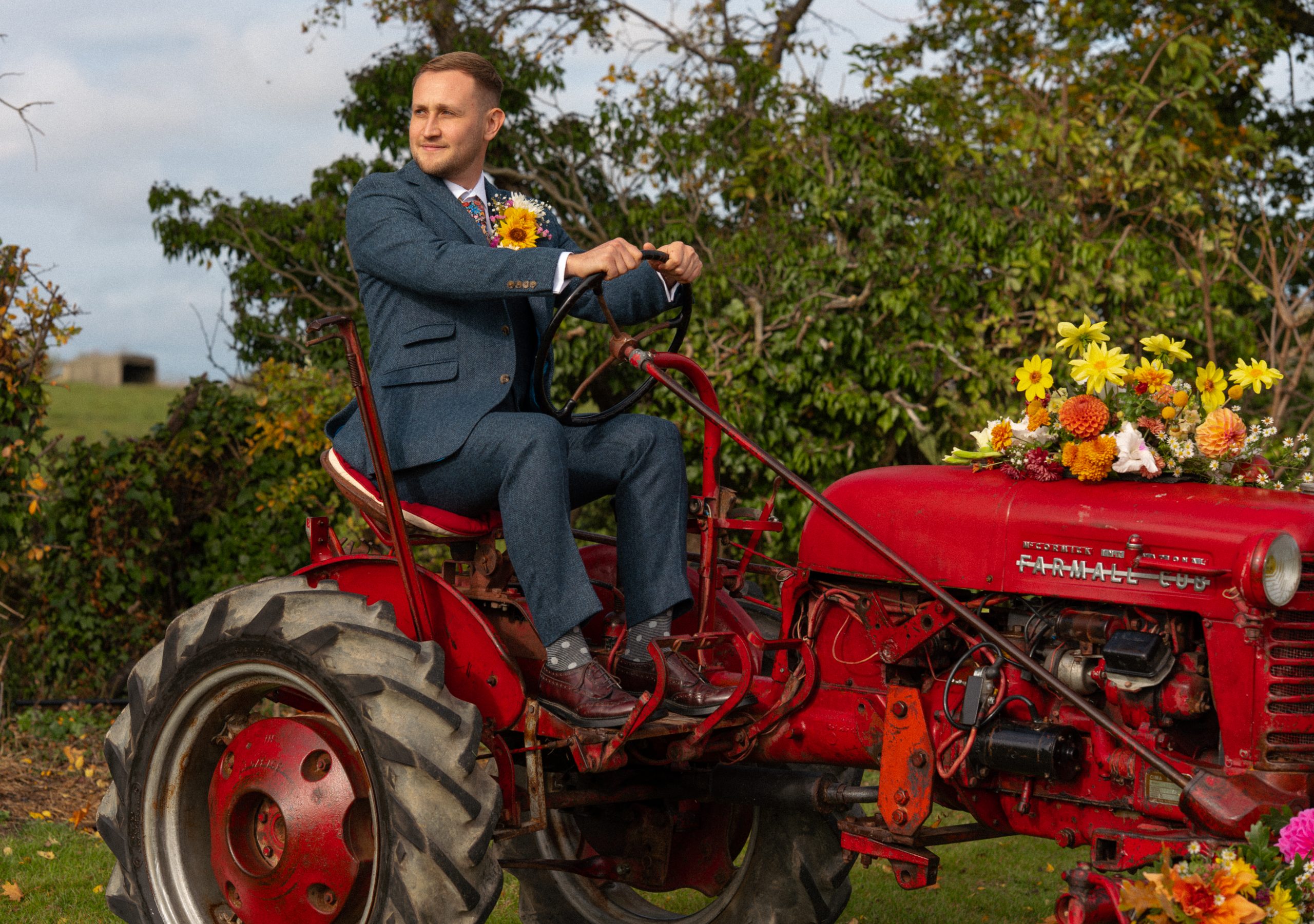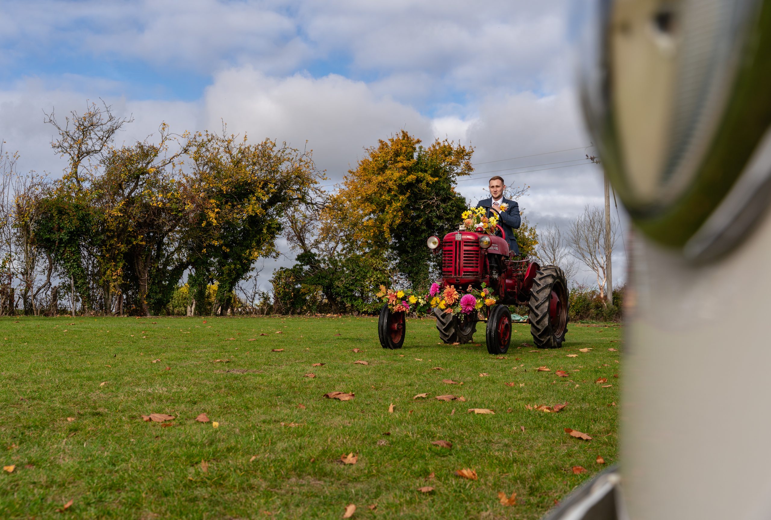 The vehicles lined up beautifully (thanks to Kate’s daughter and her partner Matt manoeuvring them like pros), and obviously, I had to throw in a little “brum brum” because staring at a lineup of vintage wedding cars without making noises should be illegal. While waiting for the glam squad, Arthur hopped on a retro tractor. He looked like a farmyard supermodel, driving past the fleet of vintage cars like the cover star of Countryside Digest.